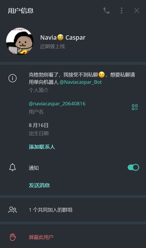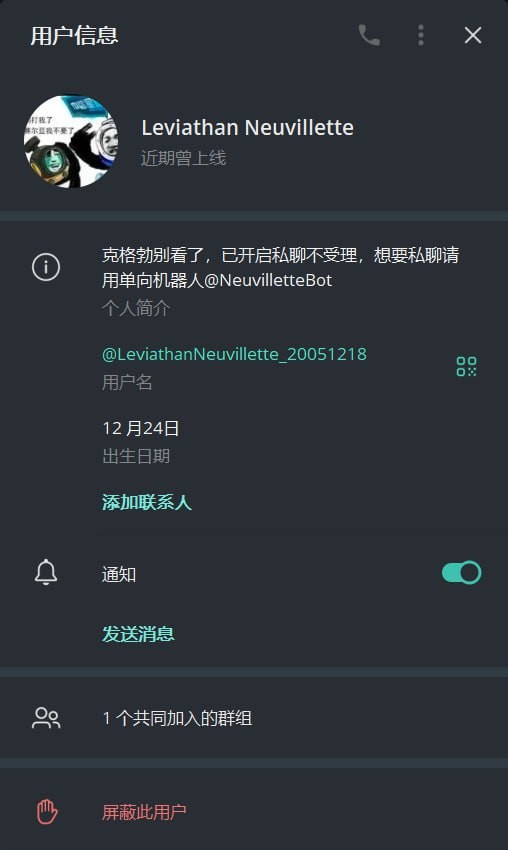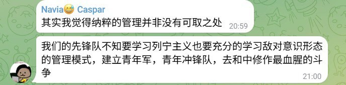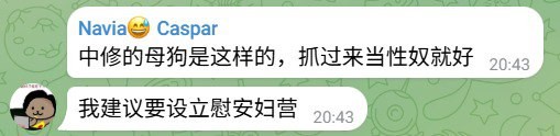在他的幻想中,他虽说也表现出愿意牺牲的姿态,但时常便是那位和同志们领导革命最终登上宝座之人,而这样的人竟然还要设立慰安妇营,把说要自己解放的人民当畜生,剥夺其接受改造之权利,其对原法西斯思想的狂热,对暴力的狂热,已然进入一种病态的倒错享乐之中。而就是这样的人,在看到有女性为自己遭遇的不公正发声时,影响了这位仁兄在群里的舆论主导地位时,他便第一个扑了上去,而我这时想着,大群不能有这样的人,一定要向群众及管理员们揭露他的丑恶。结果呢?刚把这些聊天记录发出,一瞬间我的群不见了,以为是电报出了问题,没想到后续接到通知,是我被踢了而封杀我的人正是大群管理,他不止封杀了我,还将我打成所谓“工农解放社的间谍”